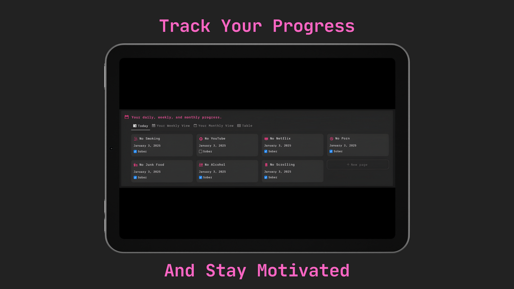 A cool-looking, compatible Addiction Breaker Notion Template to break free from all your addictions. It's has a streak feature which allows you to track your streak to keep you motivated.